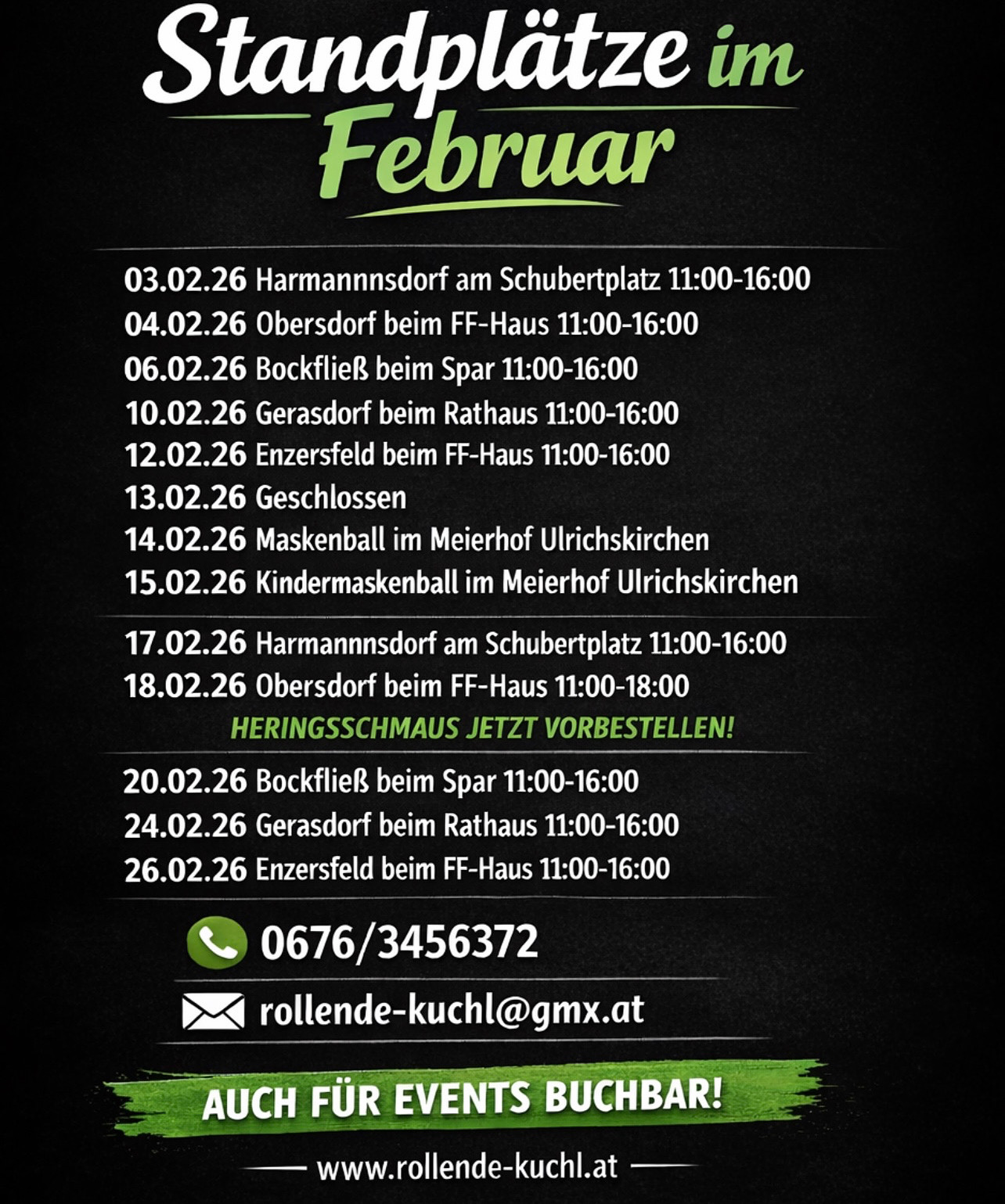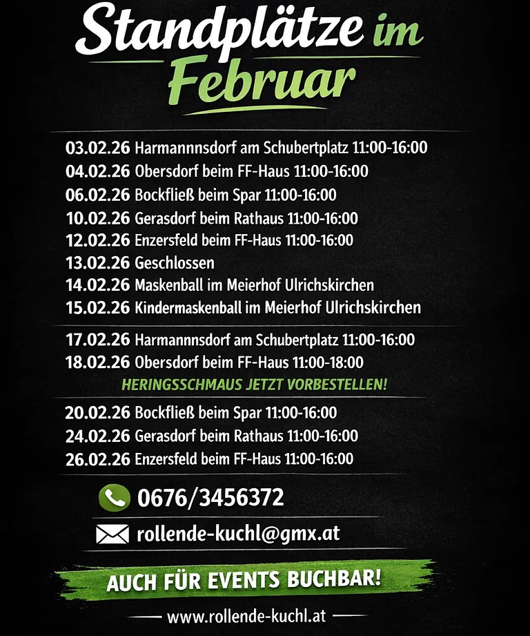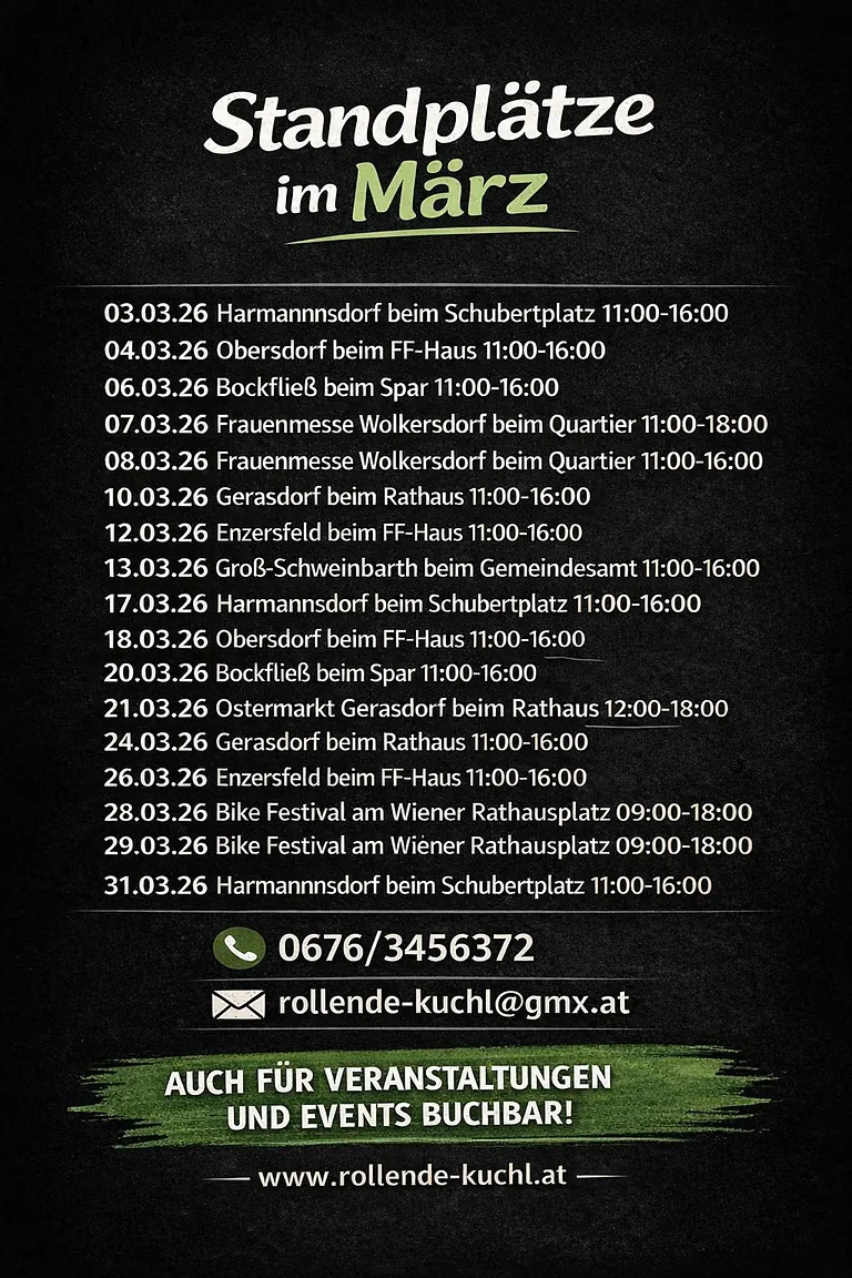 Luki’s Rollende Kuchl ist ständig unterwegs, um dir leckeres Essen direkt vor die Tür zu bringen. Wir stehen regelmäßig an sechs fixen Standorten, die sich über die ganze Woche verteilen. Zusätzlich überraschen wir dich mit spontanen Stopps an neuen Locations. Folge uns auf unseren Social-Media-Kanälen, um immer über unsere aktuellen Standorte informiert zu bleiben.